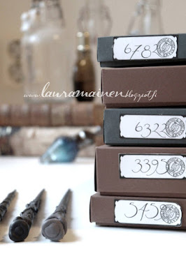 Etin netistä ensin Ollivanderin tulostettavia etikettejä, mutta koska tein näitä sauvoja enemmänkin, mm. joulumyyjäisiin leirikoulukeräyksen arpaispöytään, totesin, ettei ole tekijänoikeuksien mukaista käyttää herra Ollivanderin etikettiä, joten hääräilin koneella oman etiketin.